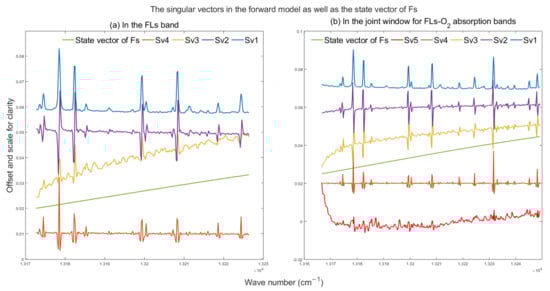 Singular vectors in the forward model and the state vector of Fs within two retrieval windows: (a) FLs band, (b) joint retrieval for FLs-O2 absorption bands.
