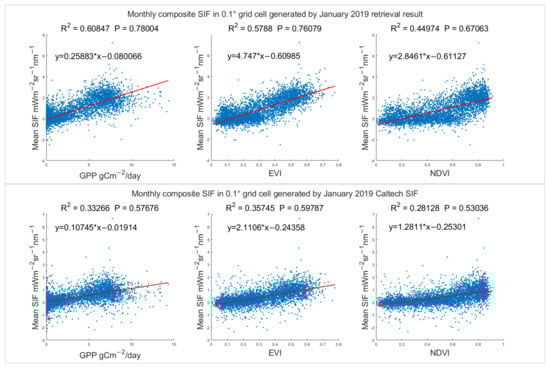 Scatter plot and goodness-of-fit (R2), Pearson correlation coefficient (P) of monthly SIF products with GPP and VI for January 2019 at 0.1° spatial resolution.