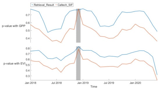 Pearson correlation coefficients (p-values) of the two SIF products with GPP and EVI at 0.1° spatial resolution and monthly scale from January 2018 to June 2020. The shaded part corresponds to December 2018 when SIF retrieves too few results.