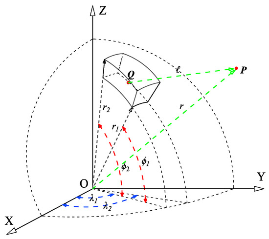 For the tesseroid-based gravitational forwarding algorithm, component of gravity gradient tensor T at observation point P due to the tesseroid cell (see Figure 1) can be expressed as