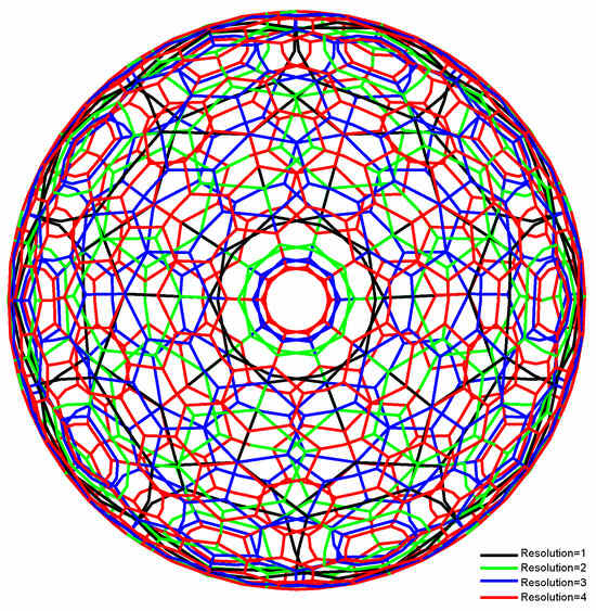 In discretizing traditional spherical shell models, inconsistencies are often found between their triangular, rhombus prism, or tesseroid cells, especially in high-latitude regions, where significant degradation phenomena occur [72]. To address these inherent defects, this study adopts spherical pentagons and hexagons (collectively referred to as DGGS grids) and their constituent prisms (i.e., DGGS cells) under the framework of the DGGS to discretize the spherical surface and spherical shell, respectively. These DGGS cells have approximate shapes and continuous scales and provide seamless global coverage through a multi-level grid system, thus effectively eliminating the inconsistency and degradation found in high-latitude regions when using the traditional methods [73]. Specifically, the primary DGGS grid consists of 12 pentagons and 30 hexagons, which can be further refined to construct a higher-precision global grid system, as shown in Figure 2. It is worth noting that the number of pentagonal DGGS cells remains unchanged when the grid is refined, reflecting the stability and flexibility of its design.