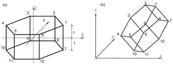 To analyze the transformation relationship of the derivative between the two coordinate systems and the volume element in Equation (14), with the help of the shape function , the isoparametric transformation is rewritten into the form of the following interpolation function: