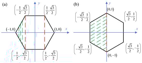 Schematic representation of regular hexagonal integration. (a) In the horizontal direction, a regular hexagon is divided into three integral domains by the red curve, e.g., the green fills the first integral domain dashed line. (b) In the vertical direction, a regular hexagon is divided into two integral domains by the red curve.