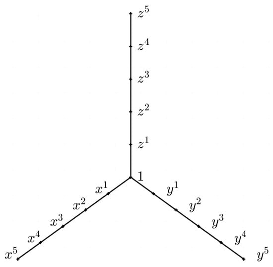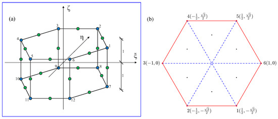 To improve the computational accuracy, we propose an alternative method for constructing the shape function of the regular hexagonal prism/isoparametric DGGS cell, with its purpose being more consistent assignment of the integral weights under isoparametric transformation. First, as shown in Figure 4, assume that a regular hexagon with nodes and its i-th vertex coordinates are denoted as . Then, the regular hexagonal is extended from the plane to the plane to construct a regular 3D hexagonal prism with nodes. Since constructing the shape functions requires specific interpolating polynomials, a list of polynomials to be used, , is determined using Pascal’s triangle, as shown in Figure 5.