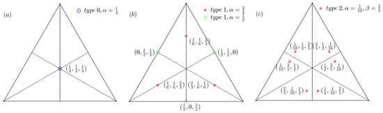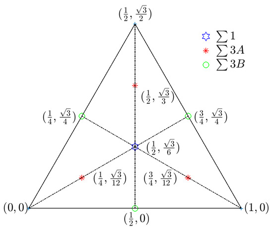 The symmetry rules for triangles remain unchanged when equilateral triangles are rotated or reflected around their medians and can be isoparametrically transformed into any other arbitrary triangle. As illustrated in Figure 8, the symmetrical integration rules for triangles primarily encompass designed combinations of type-0 (centroid), type-1 (midline point or high line), and type-2 (non-midline point). Type-0 contains only one point, namely the centroid, whose position in the barycenter coordinate system is fixed at (1/3, 1/3, 1/3). The type-1 orbit is composed of three points located in the middle, and their coordinates consist of three different arrangements of 0. The type-2 orbit contains six points not in the middle position, and their coordinates are determined by six unique arrangements of . Each orbit type contributes a different number of points. The total number of points n is determined by the number of orbits (), where 0 or 1; and can be arbitrary.