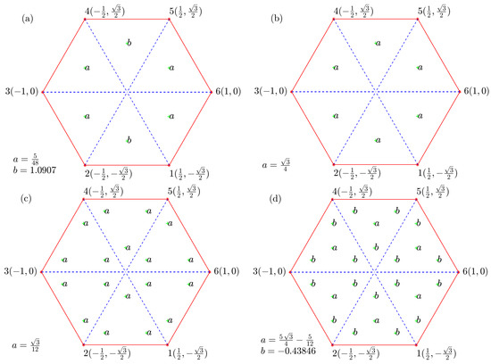 When using six equilateral triangles to form a DGGS grid, the integration weight coefficients are related to the area of the units [49,81]. Considering the unit’s symmetry and the need for subsequent comparative analyses, four integration schemes (, , , and ) are used, as shown in Figure 9. and correspond to linear integration schemes without and with unit symmetry, respectively, and and are both quadratic integration schemes with unit symmetry.