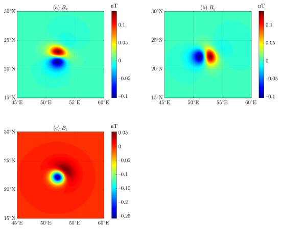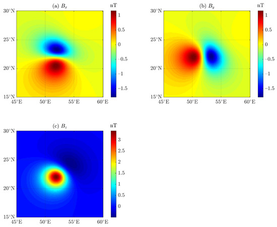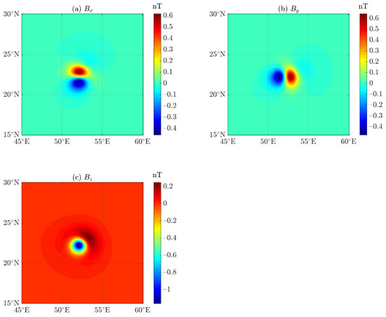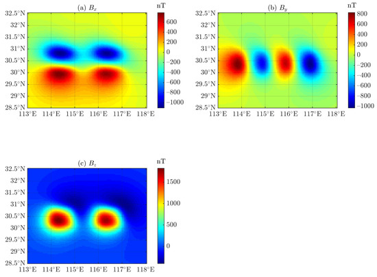 where , is the number of integration points along the three axes of the spherical coordinate system, and , , and are the corresponding integration weights. In practice, similar to other integration methods, the computational accuracy of the integral to be solved can usually be controlled by adjusting the number of integration points. However, while increasing the number of integration points will improve the GLQ’s accuracy, it may also decrease the computational efficiency [68,71]. Therefore, for the three axes of the spherical coordinate system, is equal to 2 and .