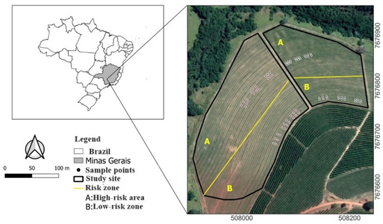 The areas were divided based on the plant positions on the terrain according to the topography and climate risk, following the methodology proposed by [14], where the risk of plant damage is classified into low-risk (B) and high-risk (A) zones. The evaluated plants were georeferenced using GPS.