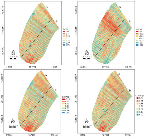 MCARI1 and MCARI2 are indices that capture variations in chlorophyll content in plants. The photosynthetically active green leaf area index is used to estimate biophysical traits [48]. In the case of MCARI2, a soil interference smoothing factor was inserted and developed to optimize the sensitivity of the index [29]. This explains why the MCARI2 index had better performance. In the one-year-old coffee, the plants are smaller and have smaller leaf area so the soil is more exposed.