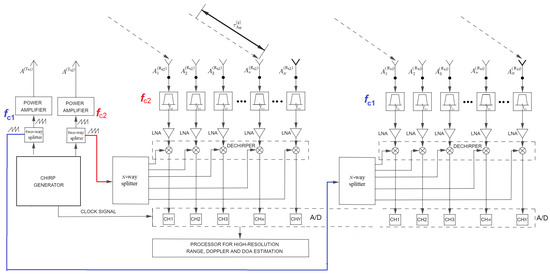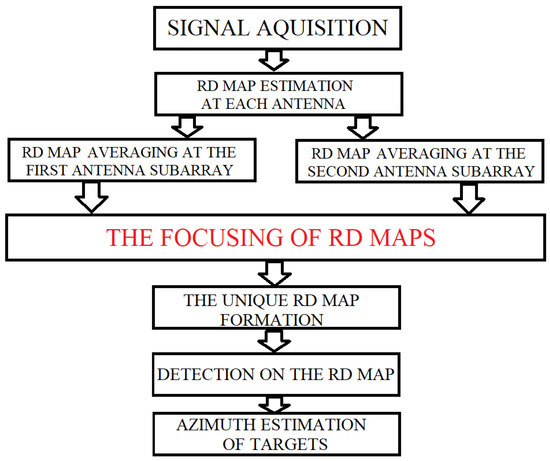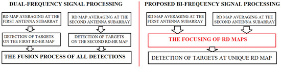 Note that this bi-frequency radar architecture allows the signal processing to be performed either separately for each of the antenna subarrays or jointly for all of the antennas. This is exactly the reason why the RD map focusing procedure shown in this section is very important.