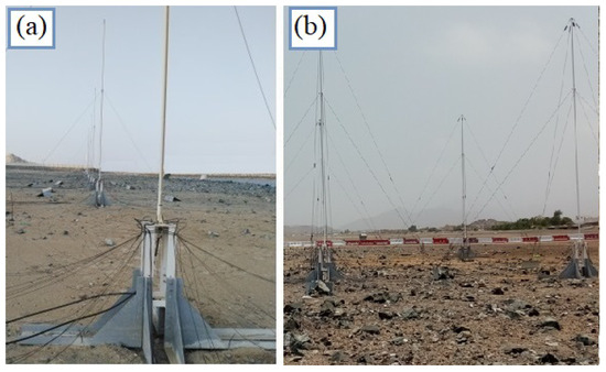 On the Tx side, a waveform generator is used to generate chirp signals at carrier frequencies and . The choice of the operating frequencies depends on the specific requirements and the required maximum distance of the targets that should be detected. As the operating frequency increases, the maximum detection distance decreases. On this specific test site, the bandwidth of the transmitted signal is 100 kHz and the chirp duration is 0.256 s. As can be seen from Figure 1, these chirp signals are fed to different amplifiers, where one amplifier is used for one pair of antennas. At this specific test site, a total of four antennas are in the Tx antenna array (two active and two passive antennas) and they are placed at the vertices of a rectangle. For this purpose, Yagi antennas, logperiodic antennas, or dipole antennas are commonly used. Tx antennas are marked in the figure as and , depending on the frequency. This is equivalent to a case in which there are two systems, where each of them operates at its own frequency. The usual transmission power is in the range of 500–1000 W. The waveform generator is also used to generate a chirp signal at a certain frequency that is used for the dechirper (one signal for one frequency), then to generate a test signal that is used to calibrate the receiving channels, and it can also be used to generate an external clock signal for the A/D converter, which is located at the output of the receiver. At the same time, it should be emphasized that combinations of different types of waveforms can be generated independently at the channels of the waveform generator.