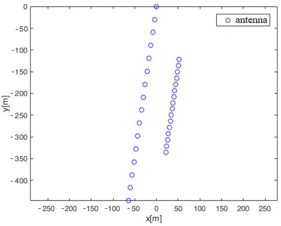 where c is the wave propagation velocity, is the range to the target at the beginning of the mth chirp, and denotes the radial speed of the target during the chirp (it is considered constant during a chirp). Also, attention should be paid to the variable , which represents the relative delay of the signal at the n-th antenna in relation to the reference point of the receiving antenna array (usually, this is the first antenna position in the antenna array). This means that there is no second reference point (for the second linear array, for example), but all delays are calculated relative to the reference point of the first antenna array. Of course, the reference point can be chosen arbitrarily (the position of the first antenna in the first or second antenna array).