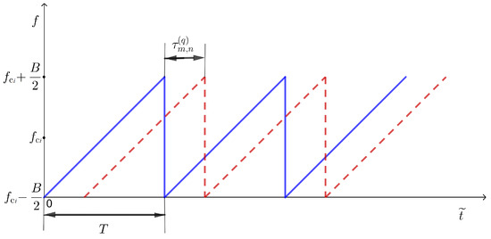 Signals that are reflected from the targets arrive at the Rx antenna array, where the delays are different at individual antenna elements. It should be noted that the number of antennas is increased, compared to the case when the system works at one frequency. Therefore, a series of chirp signals arrives, not only at the first linear antenna array (as was the case with systems operating at one frequency), but on both linear antenna arrays. Let the number of antennas in these subarrays be and , respectively. In the special case, which is used within this paper, . The time delay of the chirp signal from the Tx, which is reflected from the q-th target (located at a distance from the radar) and reaches the n-th antenna in the receiving antenna array, is defined as follows: