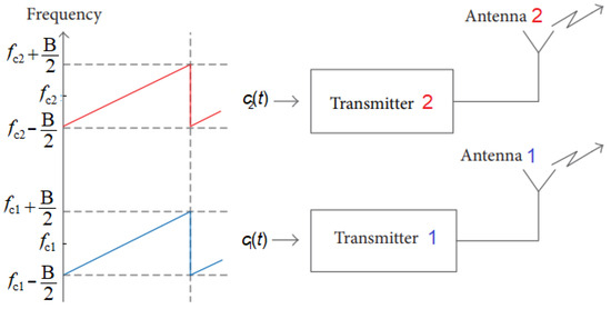 In these relations, m is actually the index (sequence number) of the chirp (known in the literature as slow time), while t refers to the time within the chirp (known as fast time). It is also necessary to note that , t, and m are mutually dependent variables. Figure 5 shows the concept of chirp signal generation at the Tx side for a bi-frequency system.