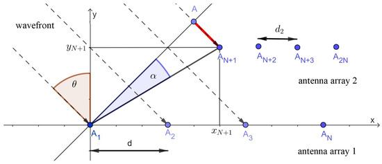 For the second linear antenna array, which is placed parallel to the first one, the delay at individual antenna elements can be determined in a similar way, with the difference that the corresponding additional delay must be entered, for the reason that, now, the first antenna in the second antenna array is not a reference point. In Figure 6, it can be seen that this additional delay is actually a consequence of the longer travel path (marked by ) such that the wave has to travel to arrive to the first antenna of the second antenna array, relative to the wave arriving at the reference antenna.