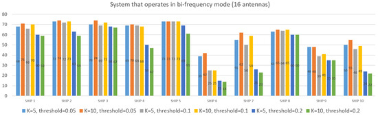 We provided the results of testing on experimentally obtained data for large ships as well as small boats. A comparison was made between the bi-frequency mode of work for the system with 8 + 8 antennas and two single-frequency systems with 16 antennas each. We used a non-uniform antenna array geometry. The results show better detectability/resolvability of the proposed method and architecture.