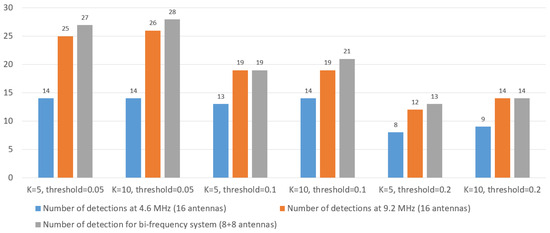 Multi-frequency architectures for the localization of sea targets and corresponding primary signal processing explained in [30,31,32,33,34] served as a motivation for testing the detectability of small boats, which is otherwise a very challenging task, primarily because such targets have a small radar cross-section, they move quickly, and often change their direction. In this paper, one of the main goals is also to show the advantage of bi-frequency small boats detection.