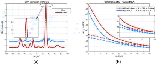 The DOA estimation performance of E-ReA and ULA. (a) Shows DOA estimation results on ULA and E-ReA based on MUSIC algorithm respectively. (b) Shows the MSE and CRB curves of E-ReA and ULA for estimating the DOA using MUSIC algorithm.