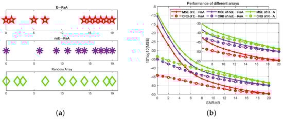 The DOA estimation performance of different sparse arrays. (a) Shows the structures of sparse arrays. (b) Shows the MSE and CRB curves of E-ReA, noE-ReA and R−A for estimating the DOA using MUSIC algorithm.