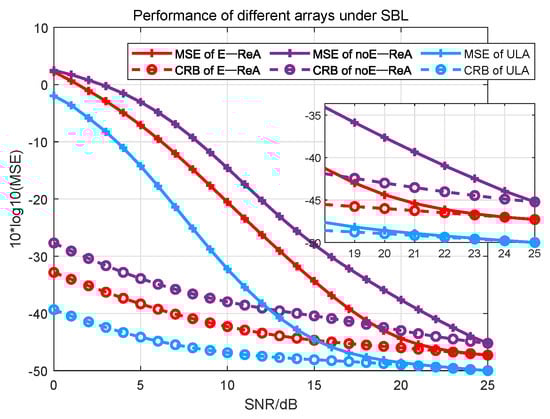 To evaluate the suitability of different DOA estimation algorithms for different arrays, a CS algorithm is employed. In the experiments, the variances of perturbation errors are same as those mentioned in Section 4.1. The Sparse Bayesian Learning (SBL) algorithm [] is employed for DOA estimation. As illustrated in Figure 5, it is evident that in the presence of perturbation errors in the array, the SBL algorithm can only ensure accurate DOA estimation under conditions of high SNR. As the SNR gradually increases, the MSEs of both E-ReA and ULA are able to rapidly approach their respective CRBs. However, noE-ReA requires a significantly higher SNR to converge to its CRB. Furthermore, it is noteworthy that within the application of the SBL algorithm, E-ReA exhibits a 2.6 dB performance enhancement over noE-ReA.