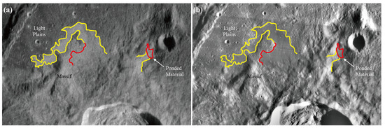 (a) Radar image and (b) Lunar Orbiter IV image of Glushko crater. Yellow outlines are indicated bounds and red outlines are inferred bounds of ejecta deposits; modified from [48].