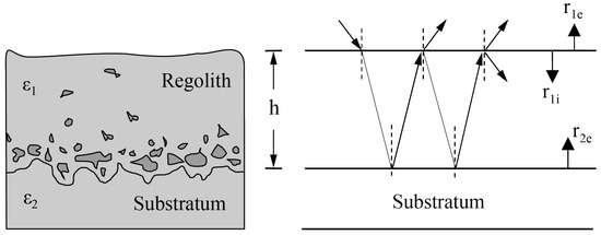 Cross-sectional diagram of lunar regolith, with a vertical structure of the lunar shadow subsurface (left) and a simplified model (right); modified from Shkuratov and Bondarenko [26]. , , and are the average Fresnel reflection coefficients from vacuum to regolith, from regolith to the substrate, and from regolith to vacuum, respectively. h is the thickness of the regolith, and and are the average dielectric constants of the regolith and the substrate.