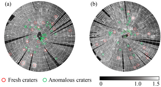 Distribution of CPR anomalous craters in the (a) northern polar region and (b) southern polar region of the Moon; modified from Spudis et al. [108].