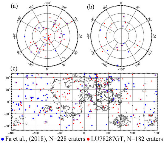 (a) Distribution of CPR anomalous craters in the lunar north pole to 70°N, (b) lunar south pole to 70°S, and (c) 70°S–70°N region; modified from Fa et al. [109].