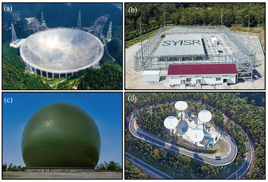 FAST, the world’s largest single-dish radio telescope can detect extremely faint radio signals [148], (see Figure 6a). Although FAST lacks active detection capabilities, it can serve as the receiving end of a GBR system for single-station or multi-station measurements [149,150]. FAST operates in the 70 MHz to 3 GHz observation band, with an antenna gain exceeding 65 dB, significantly enhancing deep space detection accuracy when used with smaller-aperture transmitting antennas [151]. QJISR, China’s first incoherent scatter radar, (see Figure 6c), boasts high antenna gain, high transmission power, and low noise levels [152,153]. Initially, QJISR was mainly used for ionospheric and space debris detection. Supported by projects like the Meridian Project, it has gradually been used for lunar exploration, enhancing China’s autonomous lunar exploration capabilities [154]. SYISR is a solid-state transmission and digital reception phased-array incoherent scatter radar, (see Figure 6b), featuring a peak power exceeding 2 MW, antenna gain over 43 dB, and noise temperature below 12 K [155]. The physical limitations of single-aperture GBR, such as aperture size and transmission power, restrict the distance and accuracy of lunar and planetary detections. The development of distributed aperture GBR systems can effectively address these limitations. By employing coherent processing technology, multiple radars can collaborate, synthesizing multiple small-aperture radars into a large-aperture radar. Phase I of the China Compound Eye project, (see Figure 6d) has completed the construction of four 16 m aperture radars, primarily for lunar exploration [147]. Phase II involves constructing 25 radars with 30 m apertures for a distributed aperture GBR system, with plans to expand to several hundred radars in phase III [40].