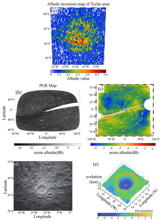(a) Radar reflectance map of the × area of Tycho crater with a minimum resolution unit size of 4.5 km × 3.7 km; modified from Sun et al. [19]. (b,c) Lunar near−surface imaging results with Qujing ISR. Tycho crater area 2D (d) and 3D (e) imaging results; modified from Long et al. [40].