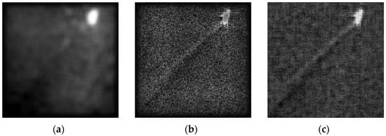 A given SAR image, denoted as a two-dimensional matrix , can be mathematically modeled as , where represents the low-rank component corresponding to the sea background, and denotes the sparse component corresponding to the ship wake [23]. The issue of wake detection, which involves separating the ship wake from the background, is reformulated as a rank minimization optimization problem and can be approximately expressed as: