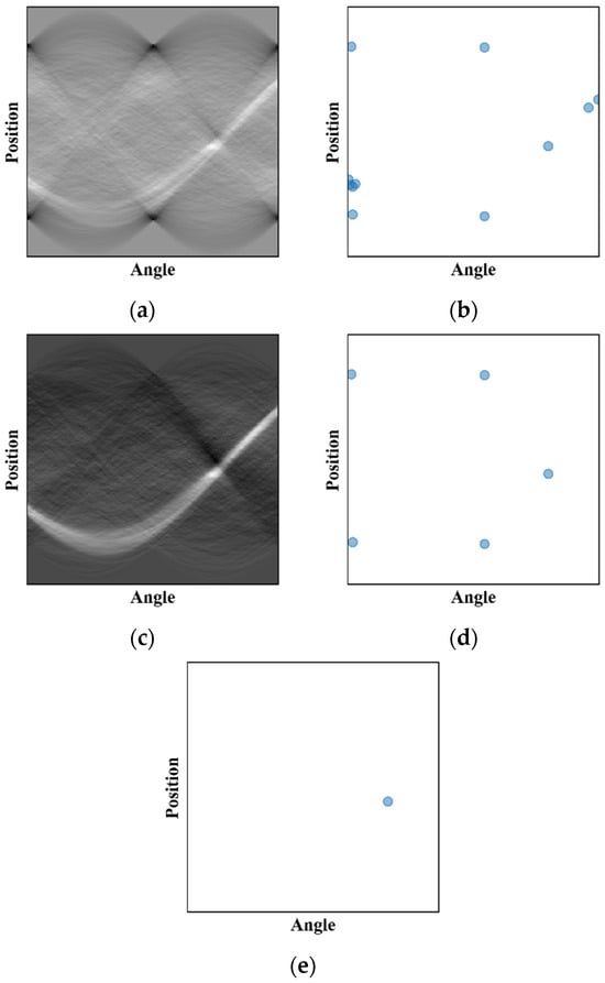 The Radon output and its clustering center point distribution. (a) The Radon outcome for the sparse wake; (b) center point distribution of (a); (c) Radon outcome for the enhanced feature map; (d) center point distribution of (c); (e) the extracted potential wake peak point.