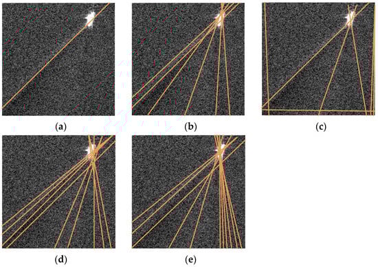 Comparison of the results of ship wake detection in sample images in Figure 5b with different methods. (a) Proposed method; (b) LRSD; (c) GMC; (d) wavelet-based method; (e) fast Radon method.