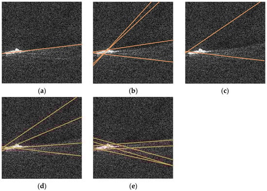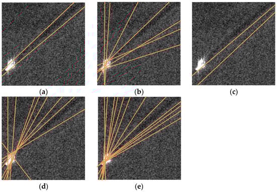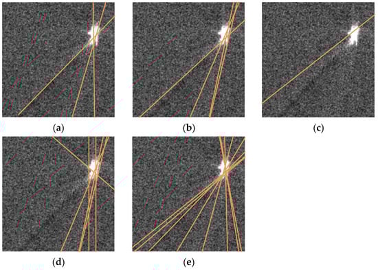 To demonstrate the performance of the proposed method, some ship wake samples from different SAR satellites were utilized for testing and comparison with other existing detection methods. The SAR image samples used for testing are depicted in Figure 5. As shown in Figure 5a–c, some ship wake data were captured by the GF-3 satellite on 31 May 2022 using the C-band frequency with a resolution of 5 m. The data in Figure 5d were obtained on 24 July 2021 with an X-band SAR sensor in the Iceye satellite with a resolution of 2.5 m. The sample in Figure 5e was acquired from open-access HRSID data and was labeled as P0137_35. In our experiments, the SAR image samples, which had a size of , encompassed different wake types, such as a narrow-V wake, as depicted in Figure 5. It was observed that the wake components were weak targets that were obscured by the background, making ship wake detection more difficult.
