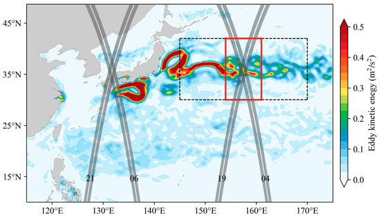 The Kuroshio Extension (KE, black box in Figure 1) is the extension of the western boundary current of the North Pacific Ocean Subtropical Gyre, occurring after the Kuroshio Current separates from the coast of Japan. Known for its strong meanders and formation of energetic eddies (Figure 1) [31,32,33], eddies in this region have been extensively studied using the DUACS SSH dataset on the identification, properties, variability, and dynamics of mesoscale eddies [34,35,36,37]. However, as previously noted, the DUACS SSH dataset is insufficient for accurately capturing fine-scale eddies ranging from 10 to 150 km. In contrast, SWOT has the capability to observe these features.