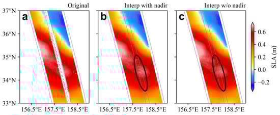 The level-3 SWOT data include measurements from both the nadir altimeter and the KaRIn (Figure 2a). The nadir altimeter is intended to fill the large gap in the middle of the swath. However, combining measurements from the two different instruments appears problematic, particularly around 34.2°N (black ellipse in Figure 2b), indicating potential systematic errors between the nadir and KaRIn measurements. Consequently, the gap was filled by linearly interpolating only the KaRIn measurements in the cross-track direction, as shown in Figure 2c.