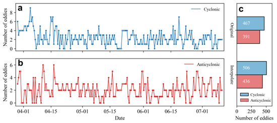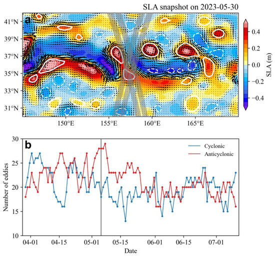 Before examining the fine-scale eddies detected by SWOT, we first revisited the mesoscale eddy characteristics using conventional altimetry data. We applied our eddy identification method to the KE region (145°E–170°E, 30°N–42°N, black box in Figure 1). Figure 3 provides an overview of the eddies in the KE region during the Cal/Val period. Since we did not consider eddies with lifetimes exceeding a certain threshold, multiple eddies were detected daily in the SLA field. Figure 3a displays a snapshot of the SLA, surface geostrophic velocity, and eddy identification. It implies that most eddies in the KE region are caused by flow shear instability [35], resulting in anticyclonic eddies north of the main stream and cyclonic eddies to the south. These eddies generally have lifetimes shorter than 20 weeks, with their radii reflecting the sheer scale of the Kuroshio. Eddies with opposite distribution characteristics are primarily pinched off from the meander, as evident in the case of the three strong anticyclonic eddies near 37°–38°N. These eddies are long-live eddies with larger sizes compared to the aforementioned eddy type. On average, there are about 41.3 eddies detected per day during the Cal/Val period, including 19.9 cyclonic eddies and 21.3 anticyclonic eddies. The temporal variation in eddy numbers (Figure 3b) shows a slight decrease in early summer compared to spring, aligning with previous studies suggesting that changes in baroclinic instability are a primary factor [43].