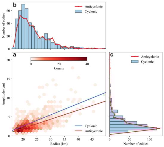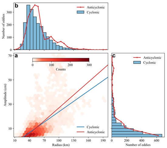 (a) Heatmap of the relationship between mesoscale eddy radius and amplitude. The blue and red line denote the linear regression of cyclonic eddies and anticyclonic eddies, respectively. (b,c) demonstrate the histogram of eddy radius and amplitude. Blue bars and red lines stand for cyclonic and anticyclonic eddies, respectively.