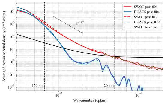 SLA spectrum from SWOT (red) and DUACS (blue) data averaged over the Cal/Val period. The solid and dashed colored lines represent the results from SWOT passes 004 and 019, respectively. The black line denotes the baseline of the SWOT error requirement. The power law of k−11/3 is displayed in the figure. The two vertical dashed lines denote the reference wavenumbers of 150 km and 20 km.