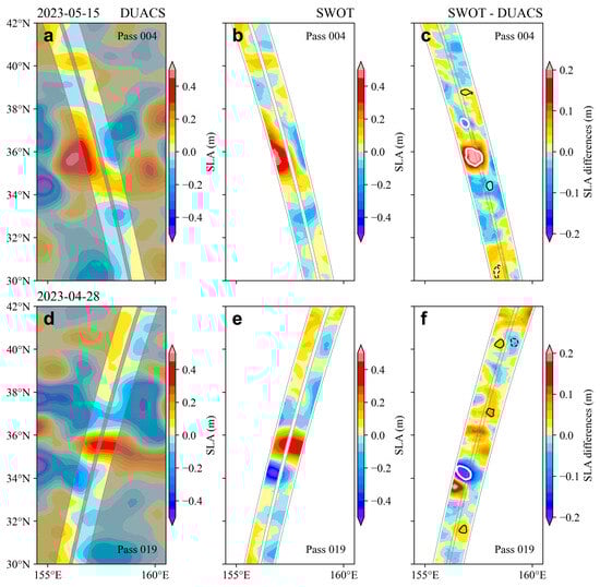 Maps of SLAs from (a) the DUACS product and (b) SWOT data on 15 May 2023 from pass 004. (c) The differences between (a,b). Gray lines indicate the extent of SWOT’s swath, with gaps between two swaths filled through linear interpolation. Circles denote the eddy identification results, with the white circles being particular fine-scale eddies that are reinforced in the main text. (d–f) Same as (a–c) but for results on 28 April 2023 from pass 019.