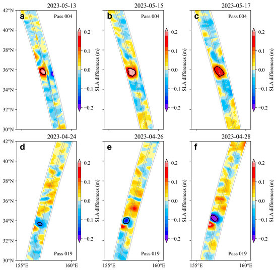 The case-selected fine-scale eddies and SLA differences evolve with time. (a–c) Results from pass 004 from 13 May 2023 to 17 May 2023. The black circles represent the case-selected eddy. (d–f) Same as (a–c) but for results from pass 019 from 24 April 2023 to 28 April 2023.