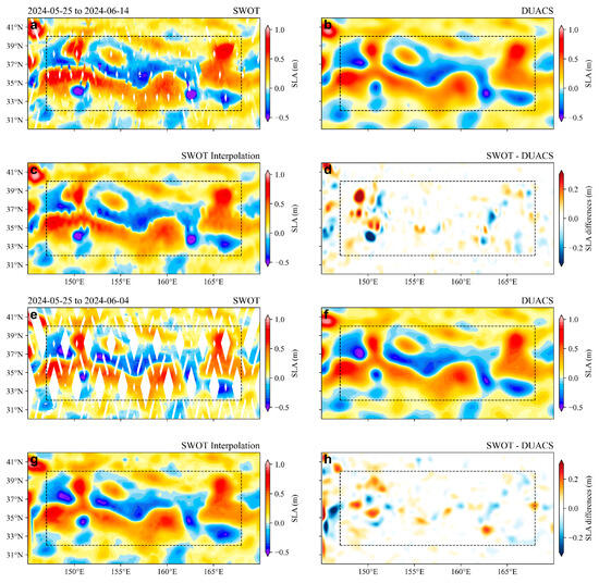 (a) Along-swath SLA derived from SWOT within a 21-day repeat cycle from 25 May 2024 to 14 June 2024. (b) The averaged SLA results during the same period derived from DUACS. (c) The mapped SLA field from (a) using linear interpolation. (d) The SLA differences between SWOT and DUACS. The black dashed box denotes the central region range. (e–h) Same as (a–d), but for one subcycle from 25 May 2024 to 4 June 2024.