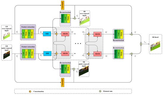 where represents bilinear amplification and represents the reconstruction operation. and are the super-resolution reconstruction results of and , respectively, without multi-exposure features. By constraining the loss functions of and , the SRB module ensures effective operation and offers reliable high-level features for subsequent MEFBs.
