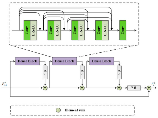 With the basic features and as inputs, the role of the SRB is to learn more high-level features and increase image resolution. Our SRB was inspired by residual-in-residual dense block (RRDB) modules [58]. The SRB network comprises multiple dense blocks with skip connections, including one at the block’s start to enhance feature transfer and prevent gradient vanishing and feature loss in deep networks, as shown in Figure 2.