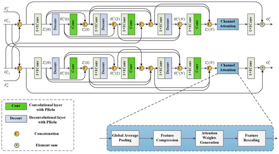 where represents the deconvolution operation in the n-th projection group. It is evident that all previous LR feature maps are combined to produce HR feature maps. Likewise, the LR feature map in the n-th projection group is created by combining all previous HR feature maps: