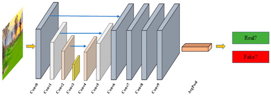 We introduce an enhanced discriminator called the relativistic average discriminator (RaD) [61] to replace the standard discriminator in SRGAN. In SRGAN, the standard discriminator is typically denoted as , where represents a sigmoid function, and is the discriminator’s output without any transformation. Conversely, the RaD formula is expressed as , where represents the average computation for all synthetic data in a mini-batch. Subsequently, the discriminator loss is derived as follows: