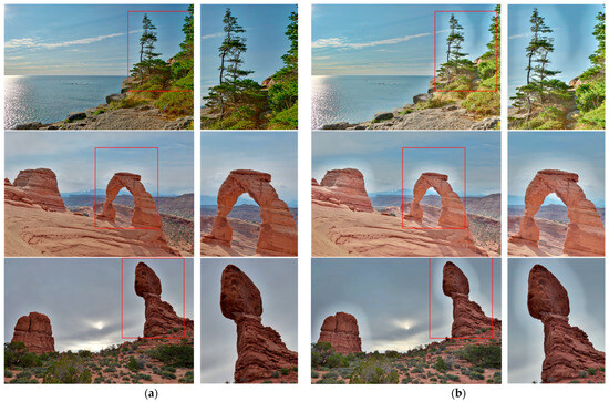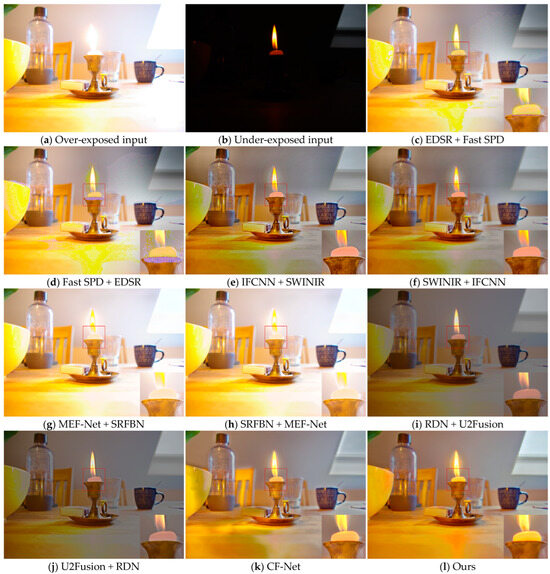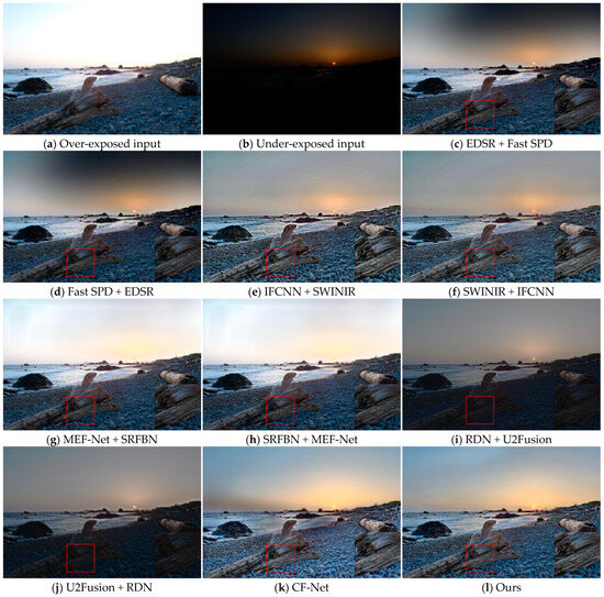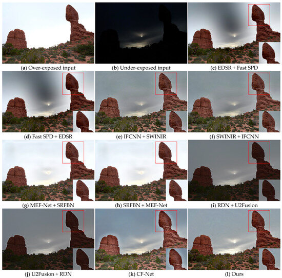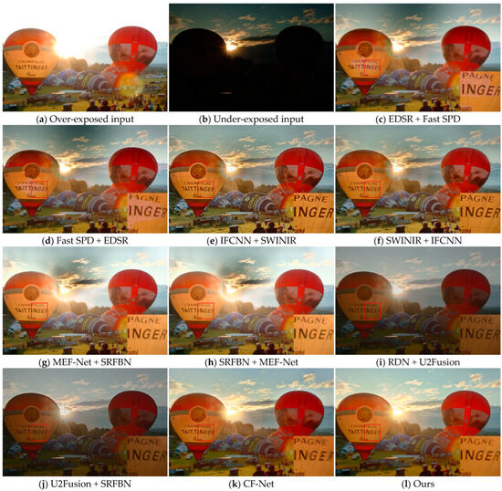 In the PQA-MEF dataset experiment, the absence of a ground truth (GT) image precluded a direct comparison of PSNR and SSIM results. Instead, we evaluated the experimental outcomes using MEF-SSIM. Our method achieved an MEF-SSIM score of 0.843 at both 2× and 4× magnification. The resulting value of 0.748 indicates that we did not attain the optimal MEF-SSIM. This limitation arose from the lack of a GT image, as we calculated MEF-SSIM by combining the input low-resolution over-exposed and under-exposed images. Following the image interpolation method, this combined image was used as a surrogate GT for the MEF-SSIM calculation. However, due to the absence of genuine HDR information in both the under-exposed and over-exposed images, the evaluation of MEF results lacked precision. It is important to note that MEF-SSIM may not provide an accurate assessment of an image’s color reproduction quality. Consequently, an image that exhibits poor structural detail or inaccurate color reproduction may still achieve a high MEF-SSIM score. However, such images are likely to be perceived as low-quality by the human eye. Specific visualization results can be found in Figure 6 and Figure 8. In Figure 6, black artifacts can be observed above the sun in the images obtained with methods (c,d). Additionally, the background of the hot air balloon letters has not been accurately restored. The solid color sections of the hot air balloons in (e,f) exhibit increased noise, and the letters display incorrect halos. Furthermore, erroneous halos and artifacts are present around the sun in figures (g,h). The overall images in figures (i,j) appear darker, and the hot air balloon letters in figure (k) contain incorrect features. In contrast, our method successfully restored both the letter features and background details of the hot air balloon, while ensuring that the sky remained free of artifacts and false halos.