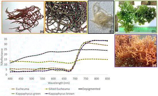 Macroalgae samples were collected from a nearshore farm at Punaga village (5°35′2.257′S, 119°25′52.058”E; South-West Sulawesi, Indonesia) in order to create a baseline spectral library. Hyperspectral visible and near-infrared measurements were recorded using a field-portable Lamba NIR spectroradiometer (Japan). After removing the dark current noise, the radiance of a 99% reflective Spectralon® (Labsphere, North Sutton, NH, USA) reference panel was measured to convert each radiance measurement into reflectance. Measurements were obtained using a fiber-optic cable. Mean reflectance was calculated from at least six spectra replicates for each sample. Spectral signatures were subsampled at 10 nm intervals in the 400–850 nm range for further examination. The samples included: (a) E. denticulatum, (b) E. denticulatum covered with silt, (c) depigmented thallus of E. denticulatum, (d) green morphotype of K. alvarezii and (e) brown morphotype of K. alvarezii (Figure 1). The average spectra along with one standard deviation (SD) boundaries are presented in the Supplementary Materials (Figures S1–S5).