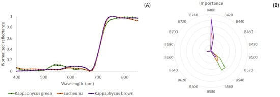 Spectral signatures of E. denticulatum and K. alvareezi green and brown morphotypes: (A) Average spectra of healthy thallus with no signs of depigmentation. (B) Diagram of wavelengths’ relative importance for discriminating Eucheuma and Kappaphycus morphotypes.