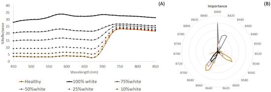 Hyperspectral signatures of E. denticulatum showing a gradient of white discolouration of the thallus: (A) Average spectra of healthy, mixed and entirely white Eucheuma thallus. (B) Diagram of wavelengths’ relative importance for characterising thallus whitening.